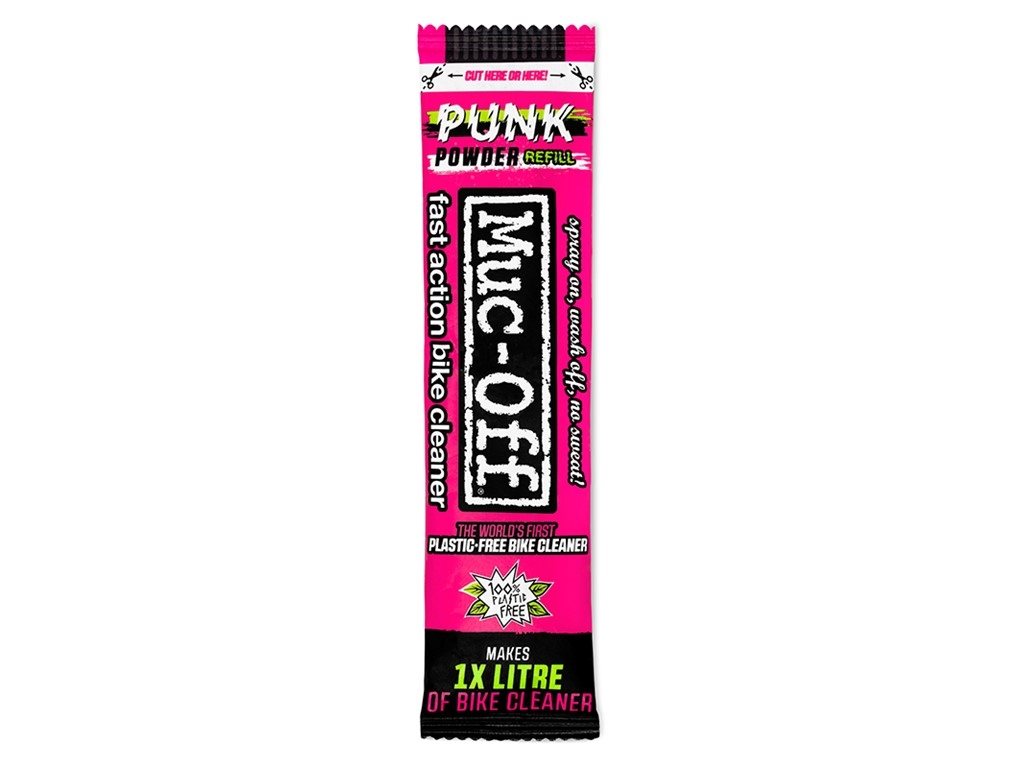 MUC-OFF Punk Powder on maailman ensimmäinen 100% muoviton pesuaine! Lisää 1 pussi pulveria 1 litran vesipulloon, ravista, ja olet valmis pesemään pyöräsi. Myyntierässä 4kpl 30g pusseja, muovittomia totta kai. Käyttämällä aina samaa pulloa vähennät muovinkäyttöä merkittävästi! Soveltuu pyörän kaikille pinnoille. Huuhtele pyörä ennen ja jälkeen punk powderin käytön. Tuote samaa tavaraa kuin suosittu Muc-Offin pinkki pyörän pesuaine.