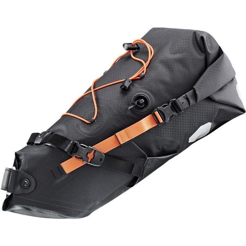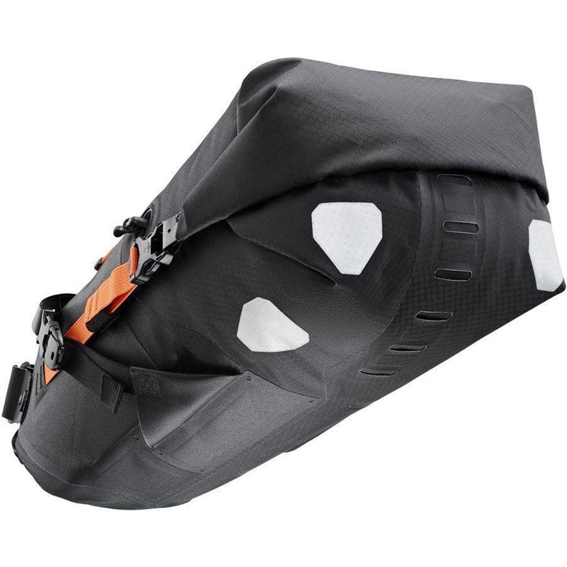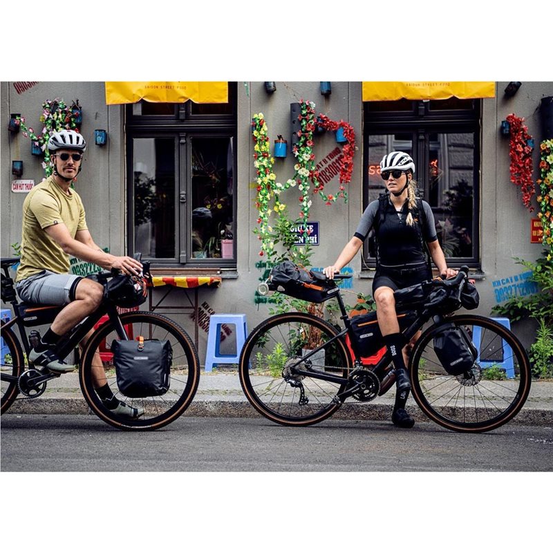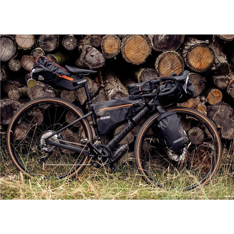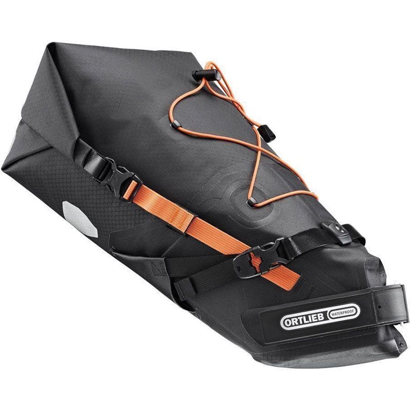 Ortliebin Bikepacking-sarjan vedenpitävä 11-litrainen satulaputkilaukku on fiksu kokonaisuus. Tarranauhoilla satulaputken ympäri kierrettävä etuosa vaatii vain 6 cm pätkän vapaata satulaputkea. Kaikki satulan ja satulaputken kanssa kontaktiin tulevat osat on valmistettu vahvistetusta kankaasta.