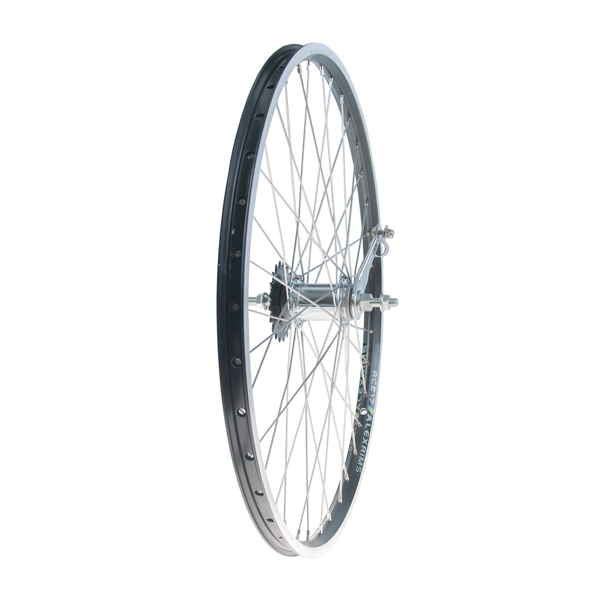 Luotettava 24" takapyörä Shimano 1-vaihdetakanavalla ja jalkajarrulla. Kestävä Alex ACE 17 -alumiinivanne, holkitetut pinnanreiät ja koneistettu jarrupinta takaavat sujuvan ja turvallisen ajon.